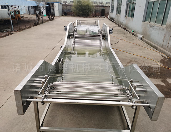 其傳送帶末端配有吹氣裝置,可將傳送帶上粘著的物料吹落,以防被帶回到清洗槽中。蔬菜清洗機自帶水循環系統,清洗槽和低貯水箱中的水經高貯水箱過濾后,由離心泵加壓再輸入水槽。所耗水量較低,符合節水要求。所有附屬裝置及構件皆可簡便安裝、拆卸和清洗。通過二至三臺的連接,可使清洗、去異物、殺菌、冷卻等工藝連續進行。